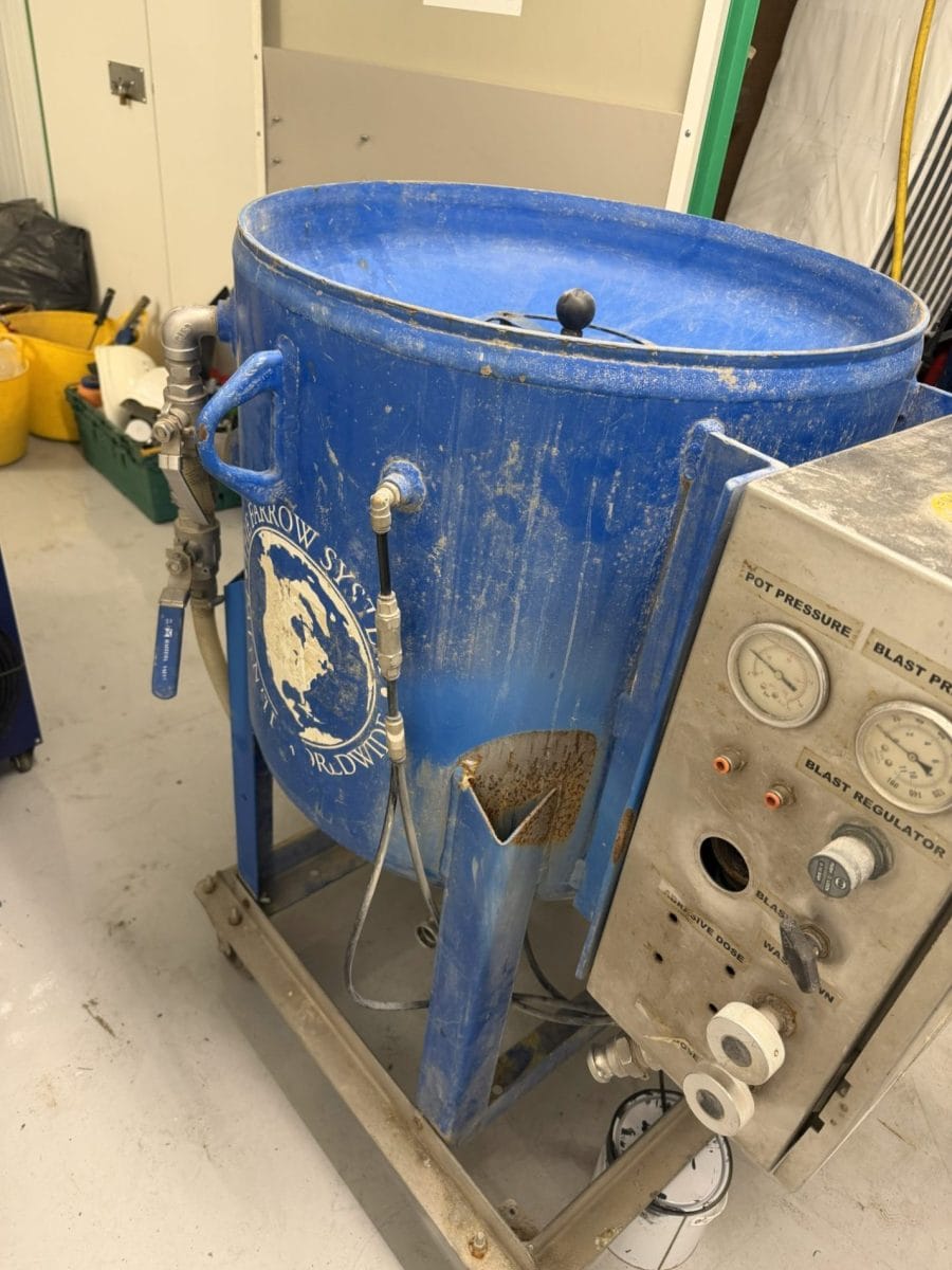 The second is a smaller unit, set up to use 1″ blast hose rather than the more normal 1.25″ hose – ideal for carrying around to do demonstrations with – it can be carried up a staircase! This machine would need above about 150cfm of air at 8bar. This pot will last about 20 minutes or so under good conditions.