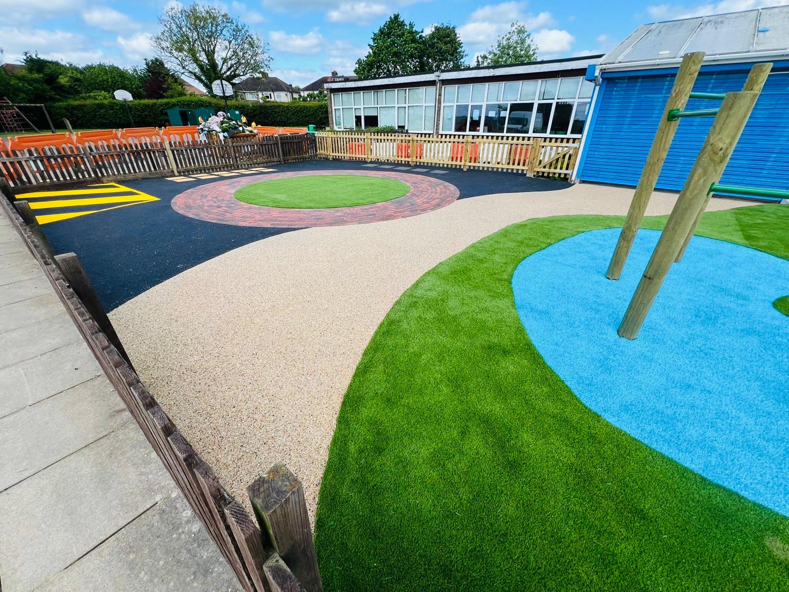 The design included a Construction Zone on hatched yellow lines, inlaid tens frames and fives frames, and a sensory circle made with brick paving, with artificial grass in the centre.