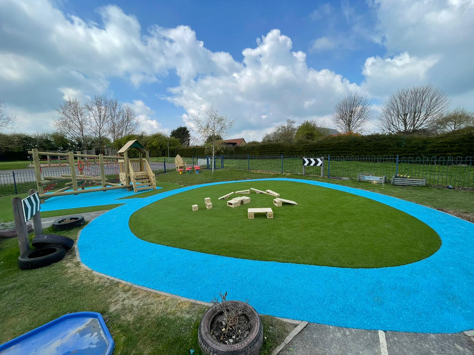 We removed the large mound in the centre of the space, and laid artificial grass throughout, with an ‘stream’ and ‘island’ in the design to spark the imagination.